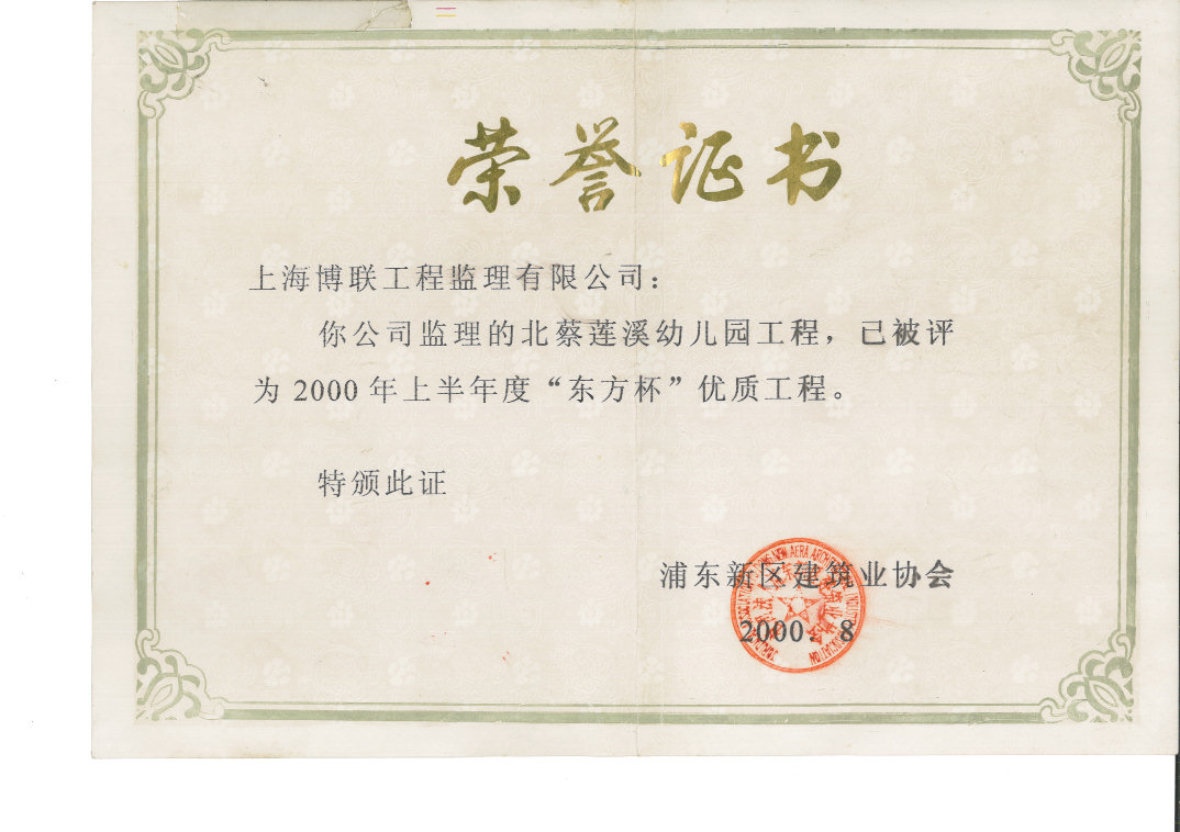 2000年东方杯(北蔡莲溪幼儿园)优质工程奖